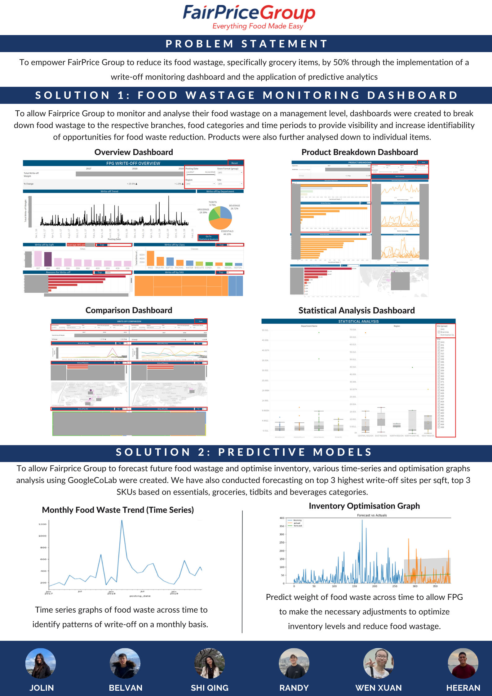 The team was tasked to empower FairPrice Group to reduce its food wastage, specifically grocery items, by 50% through the implementation of a write-off monitoring dashboard and the application of predictive analytics.